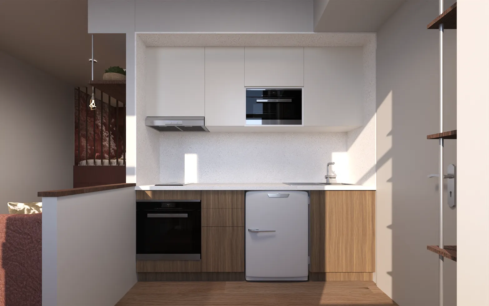 Dès l’entrée, une cuisine compacte a été conçue, intégrant un espace de rangement discret et optimisé. Le salon s’articule autour de la cheminée existante, utilisée comme élément central pour structurer la pièce et créer une atmosphère chaleureuse.